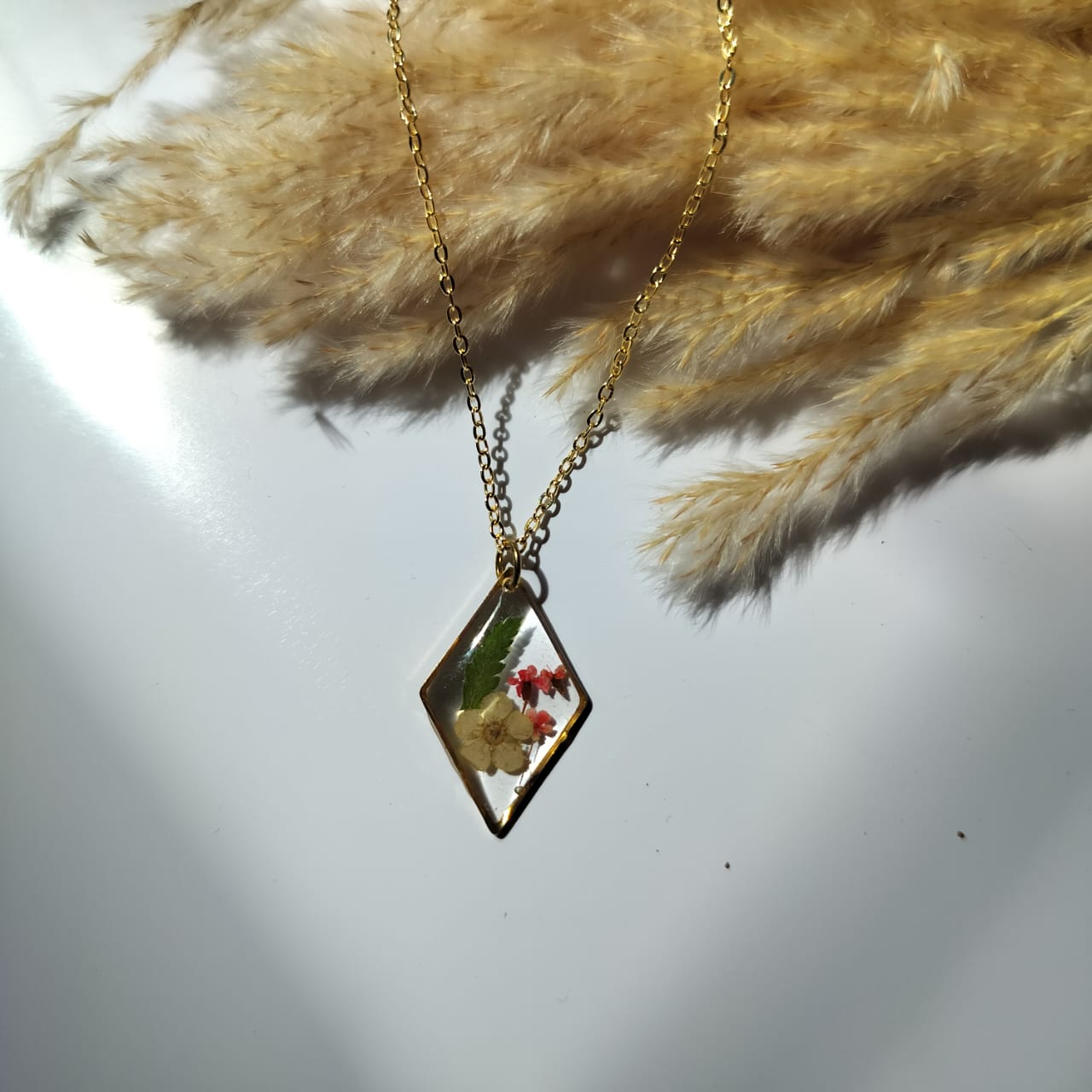 Each of our botanical necklaces features real, hand-pressed flowers preserved in crystal-clear, high-quality resin. Housed in delicate gold-toned geometric frames, these pendants capture the fleeting beauty of a garden in a timeless piece of wearable art.